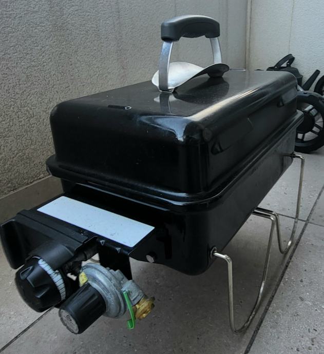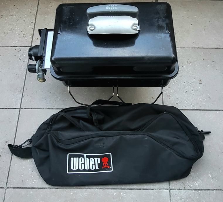 Prenosni Weber Gas žar za na piknik. Za na piknik ga lahko priključite na male plinske bombice ( cca skupno do 2,5 ure max porabe na 1 bombico) lahko pa ga z ustreznim priključkom (dobi se v trgovinah z weber opremo) priključite na navadno 5 / 10 Kg plinsko jeklenko. Zraven dodam še originalno prenosno torbo za lažji prenos in shrambo. Velikost grill plošče znaša 42cm X 26 cm. Celotni grill velikost pa 37 x 53 x 31 cm.