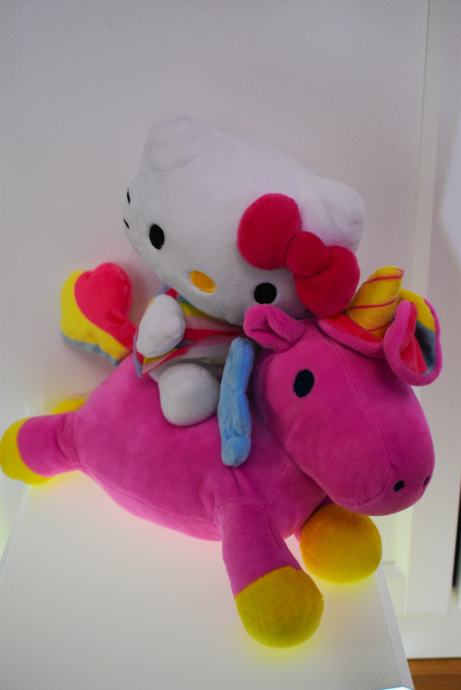 **Opomba:** Igračka ima rahlo utrgan šiv med Hello Kitty in njenim samorogom, kar jo morda dela še bolj edinstveno – z malo šiviljske ljubezni