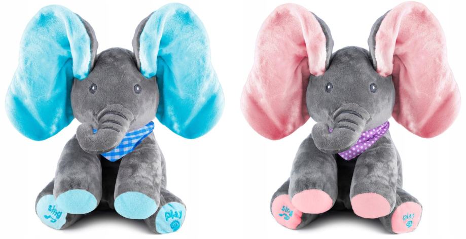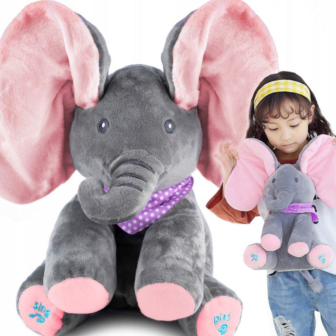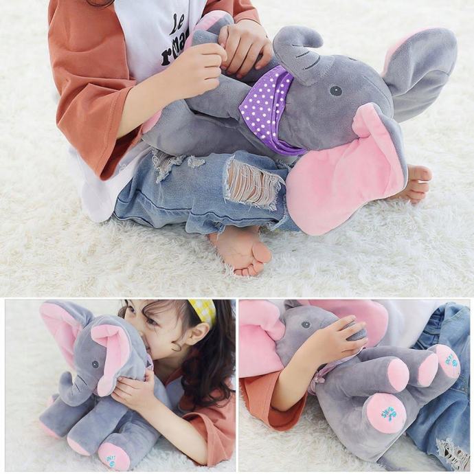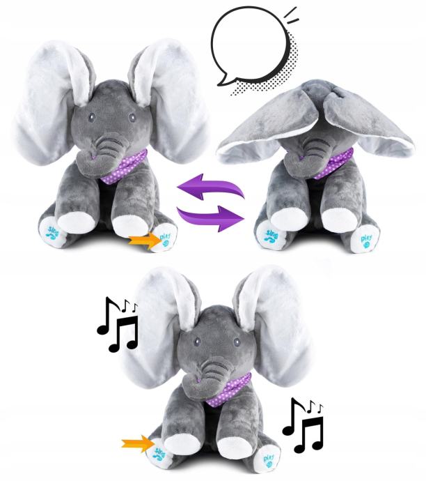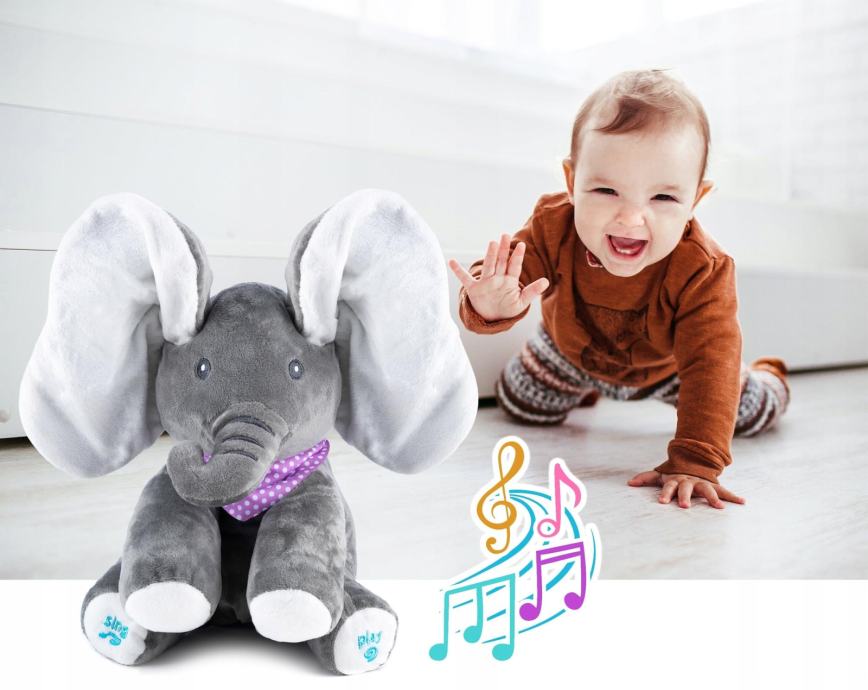 1) “Peek-A-Boo” skrivalnice – slon pokrije oči z ušesi in jih odkrije ter tako otroka spodbudi k igri z glasovnimi sporočili