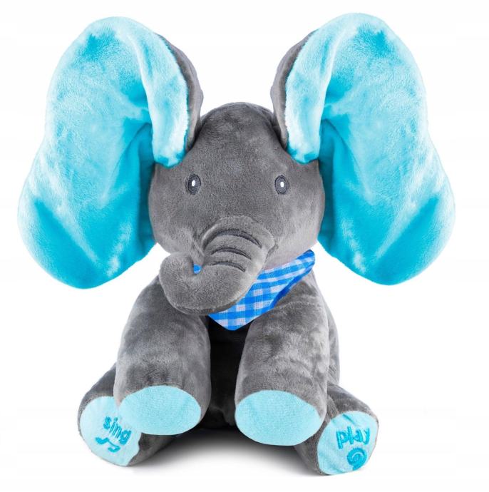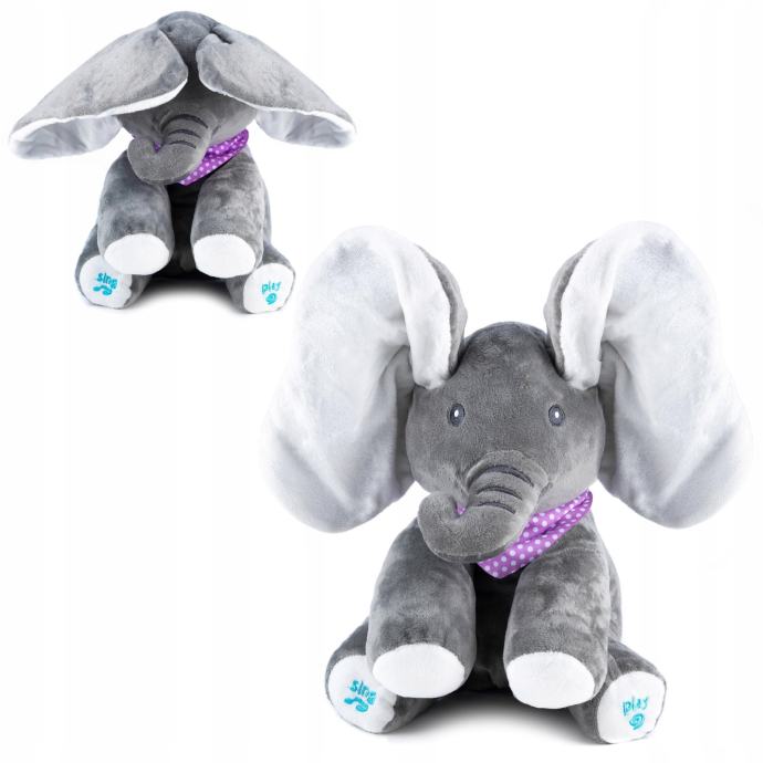 Interaktivni plišasti pojoči slonček ku-ku je popoln prijatelj za vaše malčke, ki prinaša ure zabave in veselja. Ta mehak in ljubek slonček je več kot le običajna plišasta igrača – poje, premika svoja ušesa in se igra priljubljeno igro ku-ku! Slonček bo s svojim prisrčnim glasom in gibanjem ušes očaral vašega otroka ter poskrbel za razvoj senzoričnih in motoričnih spretnosti. Izdelan iz kakovostnega, mehkega pliša, je prijeten na dotik, zaradi česar je popoln za crkljanje. Idealen je kot darilo za rojstne dneve, praznike ali kot dodatek k zbirki otrokovih najljubših igrač. Interaktivni pojoči slonček je primeren za otroke vseh starosti in zagotavlja zabavno igro ter spodbuja otrokovo domišljijo.Interaktivni plišasti slon – poje, premika ušesa in vas spodbuja k igri. Slon si pokrije oči z ušesi in se igra “skrivalnice”.2 igralna načina, ki se aktivirata z gumbi, skritimi v slonjih nogah:
