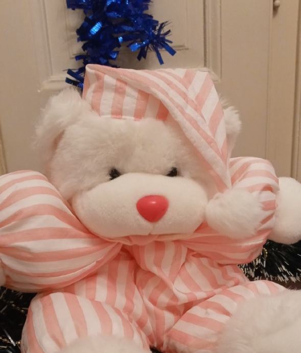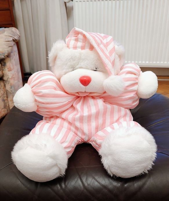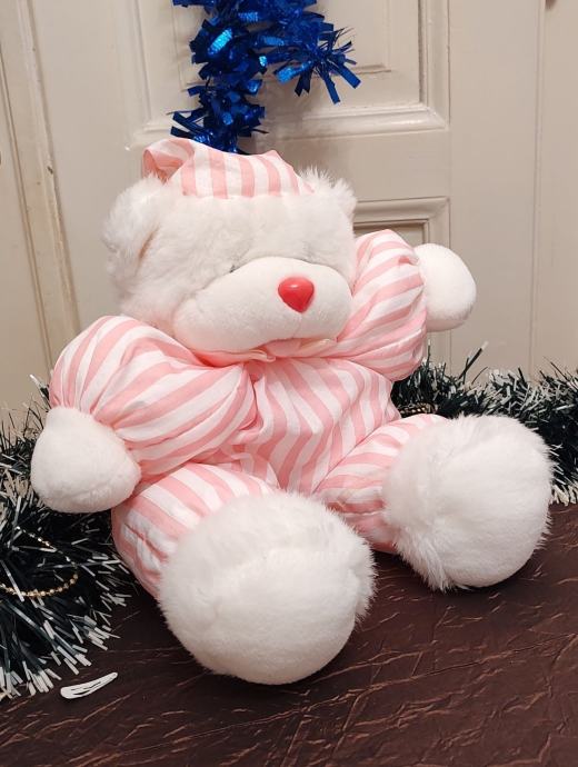 ELGANTNA PLIŠASTA MEDVEDKA OBLEČENA V ČRTASTO, ROZA BELO, PIDŽAMO.