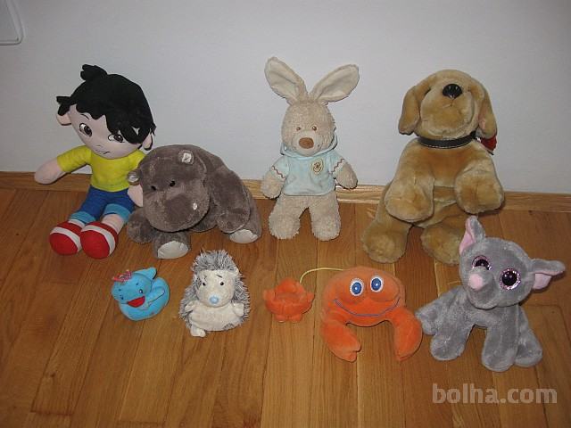 Prodam set plišastih igrač, in sicer: fantek (že prodan), nilski konj (že prodan), zajček (že prodan), rjav kužek (že prodan), modra račka, ježek, mala in velika rakovica (že prodana) in slonček. Cena za manjše je 3 EUR/ kos, za večje pa 5 EUR/ kos. Igrače so odlično ohranjene in se nahajajo na lokaciji Ljubljana-Šiška. Kontakt: 031 314 378. Zaradi selitve vljudno vabljeni k ogledu vseh ostalih oglasov!