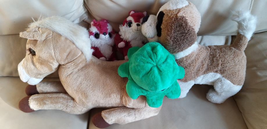 lepo ohranjene plišaste igrače, nekatere (konj, pes) z možnostjo gibanja oz. oglašanja (na baterije), vseh pliškotov ni na sliki, dodam mehko škatlo iz blaga, kontakt barcica10@gmail.com