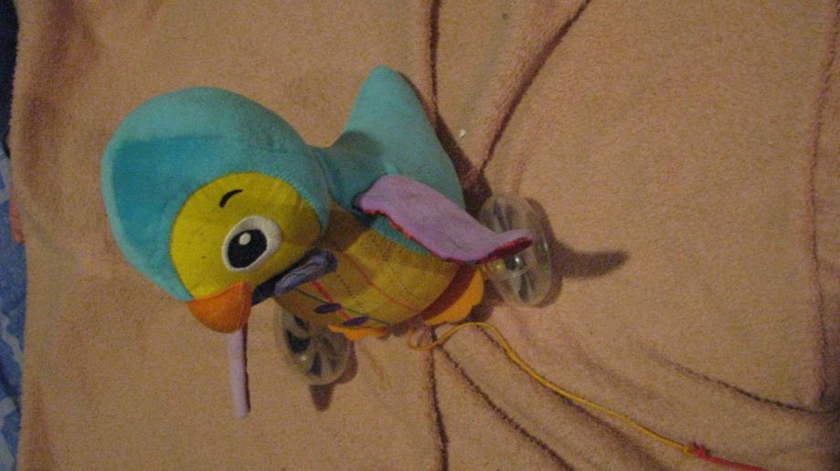 Pingvincek, ki se ga pelje z vrvico. Zvočna plišasta igraca. Krila so sumeča, kolesa se vrtijo, v notranjosti imajo kroglice, ki oddajajo zvok. Cena s ptt12ev