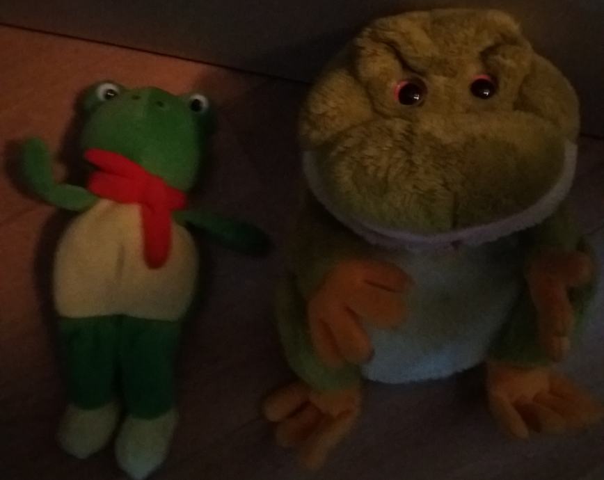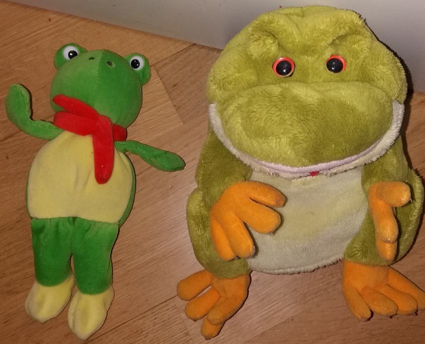 Prodam igračo žabico zelena z rdečim šalom 6e. Zraven svetlejša za na roke za igrice predstave 12e slika 1, 2,3
