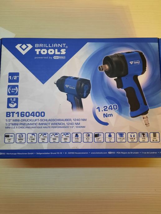 Prodam nov zapakiran udarni vijačnik BRILLIANT TOOLS BT160400. Karakteristike so vidne na sliki. Prodam zaradi napačnega nakupa oz. imam premajhen kompresor. Podatki o moči so na sliki.