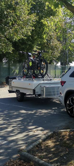 Prikolico vam prodam v celoti ali brez dodatne opreme, kot so kufri in prtljažnik za kolesa Thule, ki je montiran na vrhu pokrova.