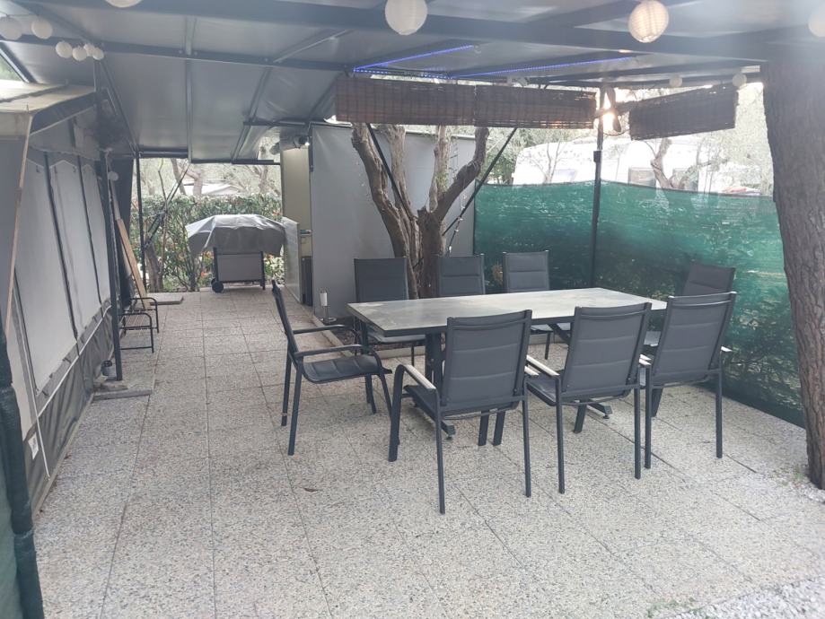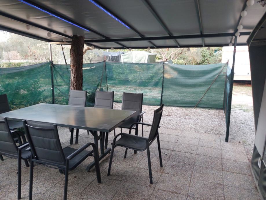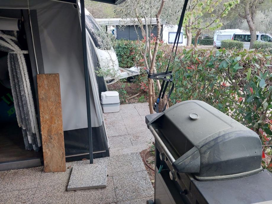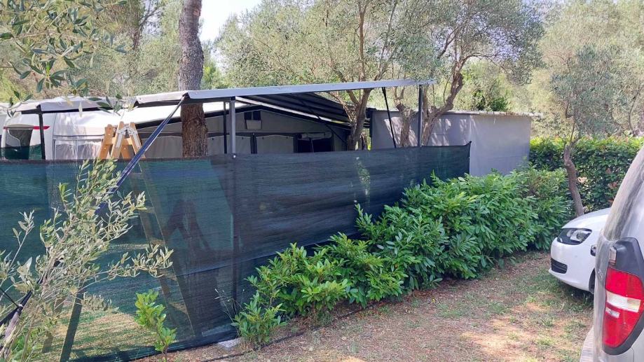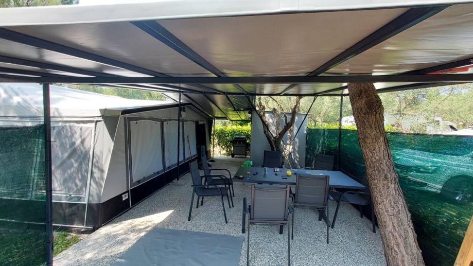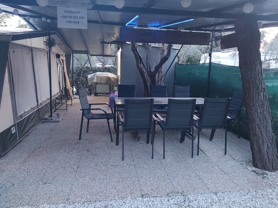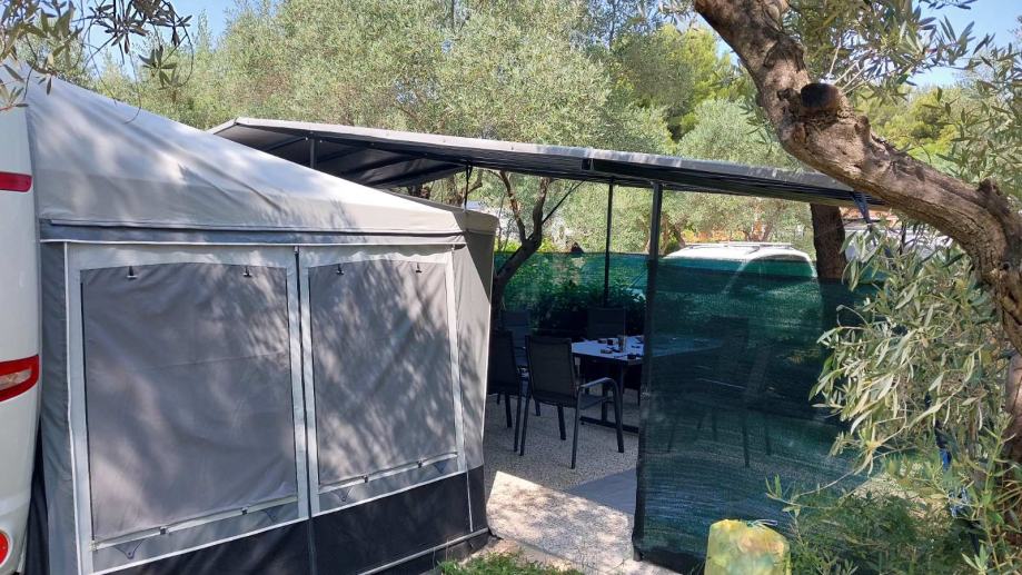 Za baldahinom je nekaj prostora za namestitev tuša ali podobne zadeve. Pri kuhinji pod drevesom je cca 2*2m zaklučeno s alu zaklučki in nasuta zemlja, tako da se lahko posadi kakšne začimbe... od nadstreška do ceste, kjer je ograja je nasut prod. Med cesto in baldahinom/prikolico je prostor za avto Do WC bloka je cca 30m. Parcela se nahaja dobrih 100m od bazena, medtem ko je do lepih in urejenih plaž le nekaj minut hoje.