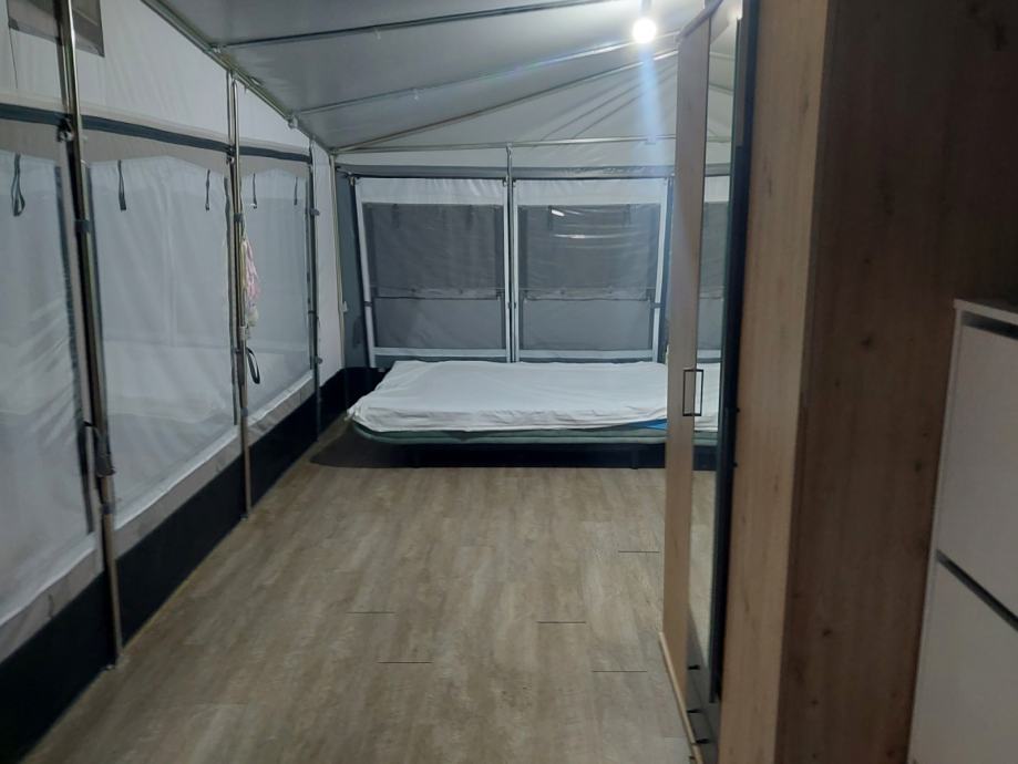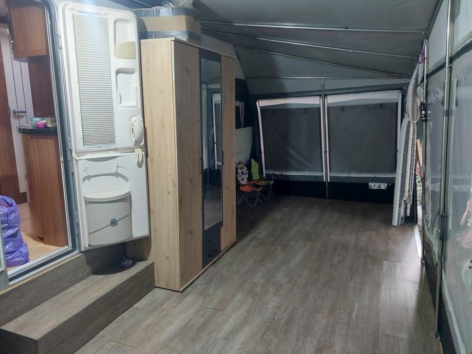 Baldahin višjega cenovnega razreda, širine 2,4m... Obojestransko plastificiran. Star 2 leti... V baldahinu narejena lesena podkonstrukcija, na njo dane opažne plošče in položen PVC (vinil) po podnu in stranici kjer je prikolica spodaj odprta (do vrh kolotekov)... V baldahinu je 2 leti star kavč, ki se raztegne tako da lahko prespita dve osebi. Poleg je večja omara in ena omara za čevlje...