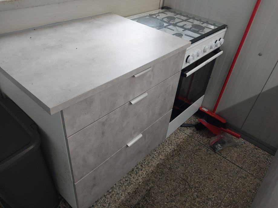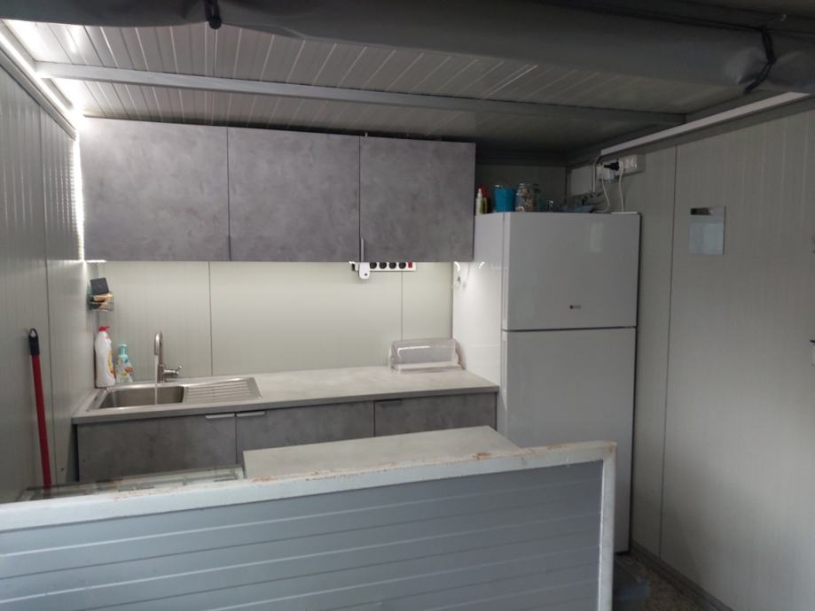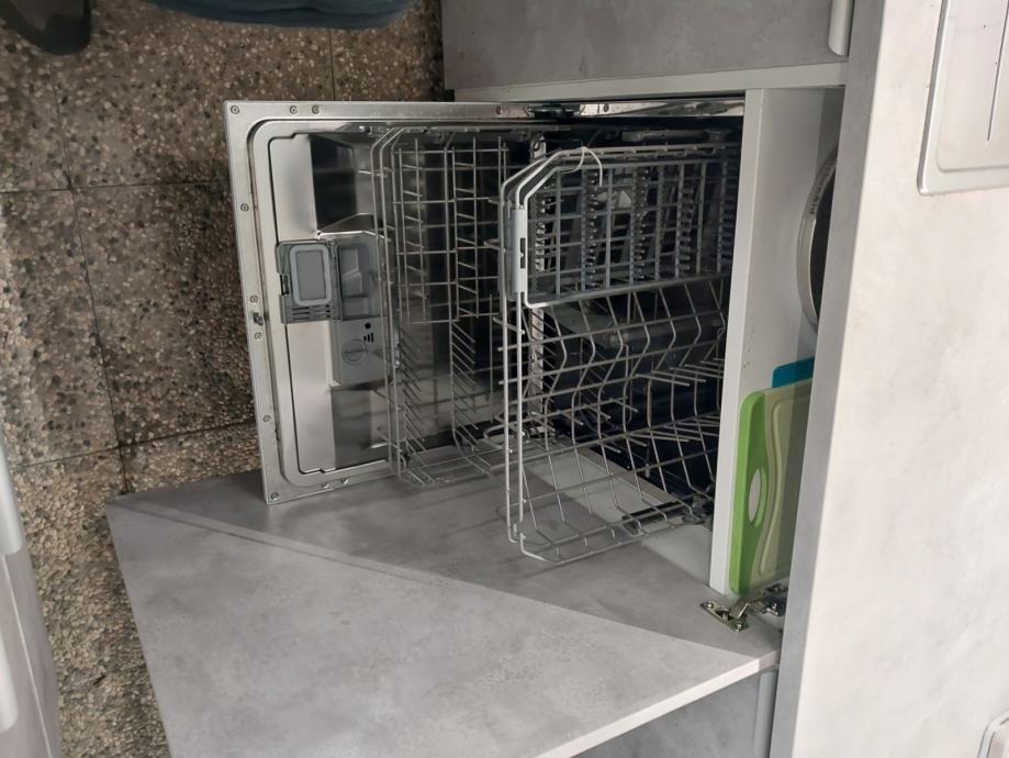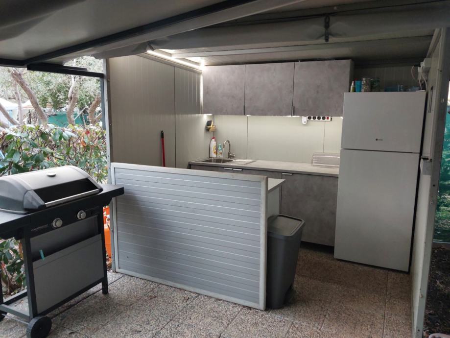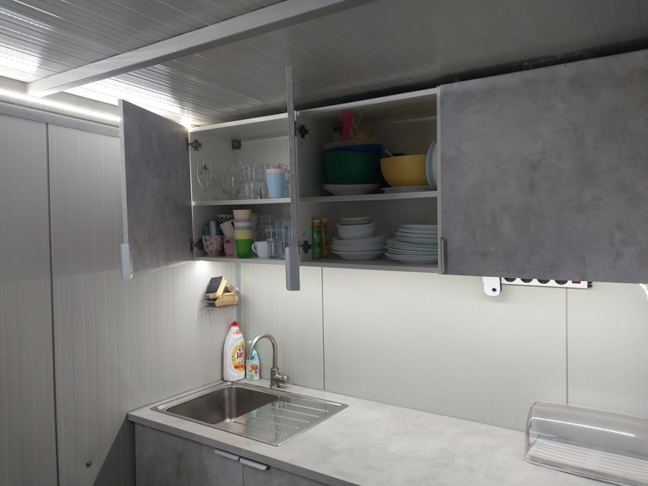Kuhinja izdelana iz jeklenih profilov in oblečena s izolacijskimi paneli, čez njih pa je še napeto platno da bolj zgleda kot šotor... v kuhinji je plinski štedilnik s pečico, omara s pultom s tremi večjimi predali, potem pa tri omare (zgoraj + spodaj)... ogromen hladilnik z zamrzovalnikom... pomivalni stroj v sredinski omari. Komplet elektro inštalacija z vtičnicami kjer se potrebujejo, led razsvetljavo, bojler 80L... V omarah kozarci, krožniki, posoda, pribor… Spredaj je platno katero se spusti in s tem zapre kuhinjo. Ob kuhinji je kvaliteten plinski žar.