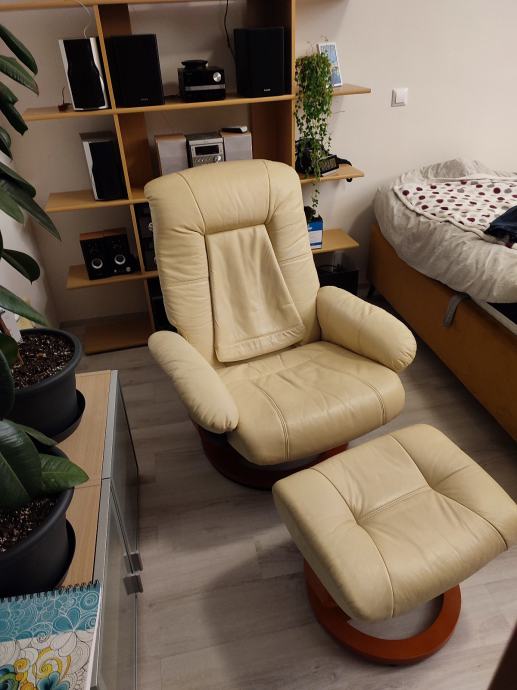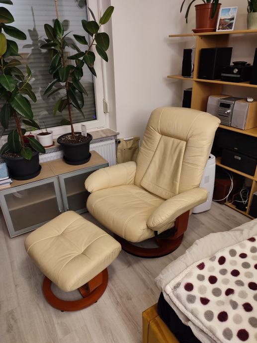 Prodam rabljena udobna usnjena fotelj krem barve z lesenim podstavkom in pripadajočim stolčkom za noge. Fotelj je na dveh mestih malo obrabljen, masažne funkcije nisem uporabljal. Cena ni zadnja.