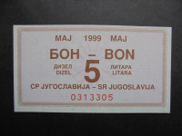 Jugoslavija BON za gorivo zeleni 5 litrov dizel MAJ 1999 UNCLokacija: Ljubljana Vič Rudnik, Vič - Dolgi mostObjavljen: 12.12.2025.Shrani oglasUporabnik ni trgovec2,20 €