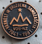 Značka VOS NZ Varnost in družbena samozaščita 1941/1981 bronastaLokacija: Ljubljana Vič Rudnik, Vič - Dolgi mostObjavljen: 08.12.2025.Shrani oglasUporabnik ni trgovec1,50 €
