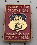 Značka 15. Republiške športne igre OŠ s PP Tolmin 1983Lokacija: Ljubljana Vič Rudnik, Vič - Dolgi mostObjavljen: 19.11.2025.Shrani oglasUporabnik ni trgovec1,20 €