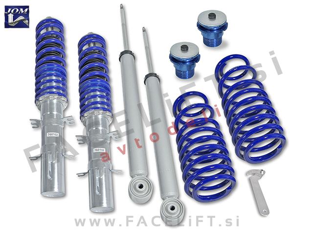 Nastavljivo vzmetenje (gewinde) JOM BlueLine. Vzmetenje je novo, z garancijo. Komplet vsebuje štiri amortizerje, štiri vzmeti in ključ za nastavitev višine.