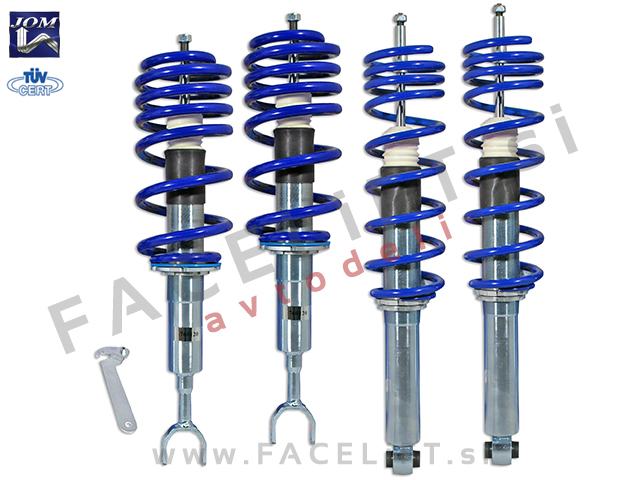 Nastavljivo vzmetenje (gewinde) JOM. Vzmetenje je novo, z garancijo. Komplet vsebuje štiri amortizerje, štiri vzmeti in ključ za nastavitev višine.