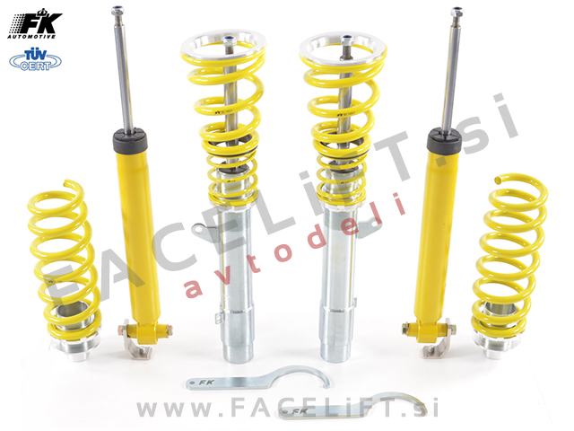 Nastavljivo vzmetenje (gewinde) FK. Vzmetenje je novo, z garancijo. Komplet vsebuje štiri amortizerje, štiri vzmeti in ključ za nastavitev višine.