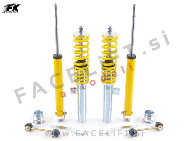Po višini in trdoti nastavljivo vzmetenje (gewinde) FK. Vzmetenje je novo, z garancijo. Komplet vsebuje štiri amortizerje, štiri vzmeti, sprednje stabilizatorje in ključ za nastavitev višine.