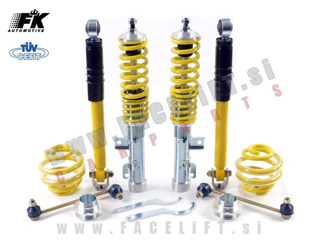 Nastavljivo vzmetenje (gewinde) FK. Vzmetenje je novo, z garancijo. Komplet vsebuje štiri amortizerje, štiri vzmeti, sprednja stabilizatorja in ključ za nastavitev višine.