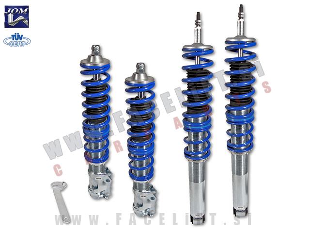 Nastavljivo vzmetenje (gewinde) JOM. Vzmetenje je novo, z garancijo. Komplet vsebuje štiri amortizerje, štiri vzmeti in ključ za nastavitev višine.