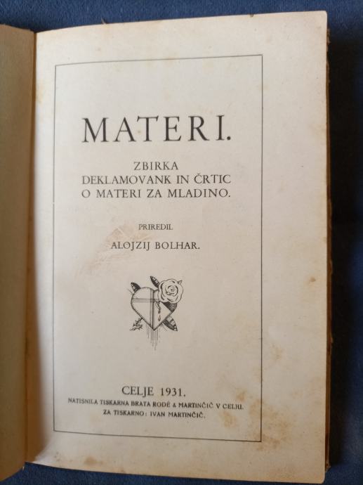 materi(zbirka deklamovank in črtic o materi za mladino),priredil Alojzij Bolhar,Celje 1931 letnik, knjiga ima 89 strani, pošljem po pošti ali osebni prevzem.