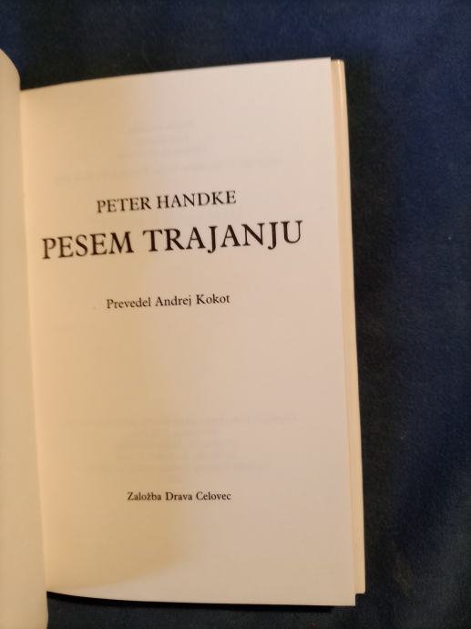 pesem trajanju,avtor Peter Handke,zalozba Drava Celovec 1987 letnik, knjiga ima 50 strani, pošljem po pošti ali osebni prevzem.Knjiga je v zaboju pod zaporedno številko 83.