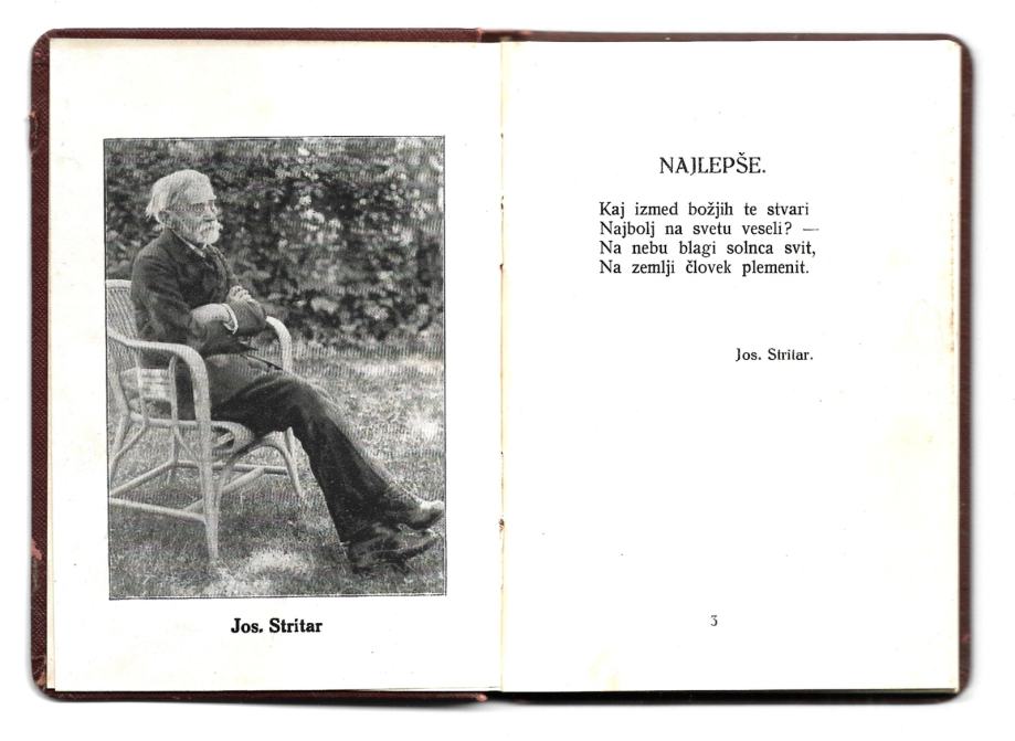 Zadnji pesniški utrinki Josipa Stritarja, knjižica je vezana v platno z zlatimi napisi, ima pa 63 strani pesmi + Stritarjevo fotografijo, odlična ohranjenost. Bila je v lastni zbirki.