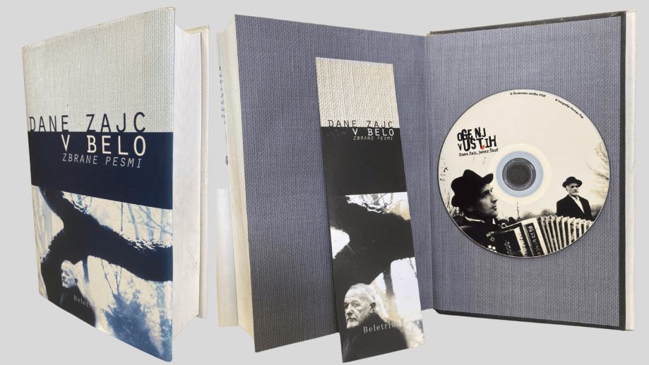 - V BELO, zbrane pesmi + CD - Dane Zajc - 20€ (dobro ohranjen izvod, Zbirka Beletrina, https://najdiknjigo.si/izdelek/v-belo-zbrane-pesmi/ )