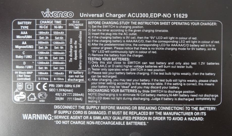 Polni lahko Ni-Mh in Ni-Cd baterije velikosti AAA, AA, C, D ter 9V baterije.