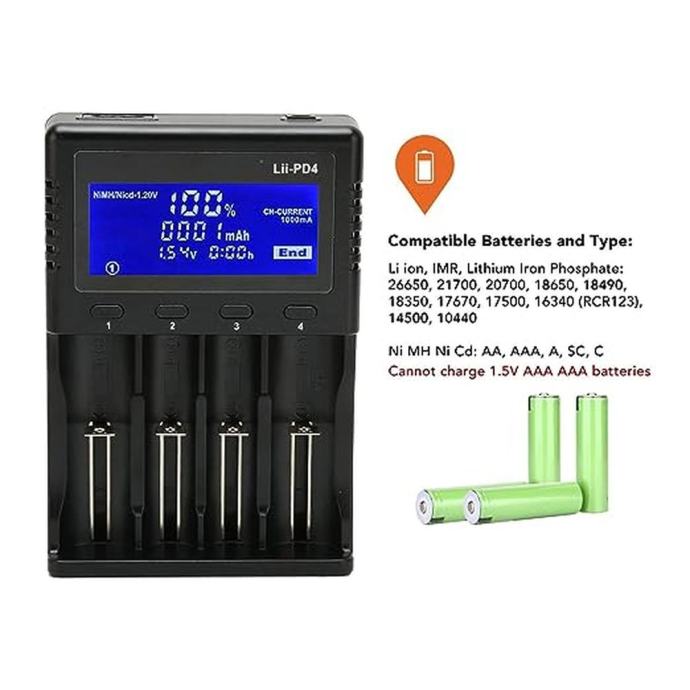 (Li-ion/IMR/LiFePO4: 26650,21700,20700, 18650, 18490, 18350, 17670, 17500, 16340(RCR123), 14500, 10440 NiMH/Cd: AA, AAA, SC, C)