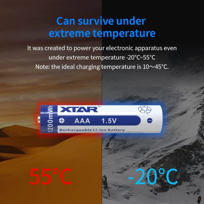 XTAR AA baterija z napetostjo 1.5V in kapaciteto 2000mAh je zasnovana na sodobni Li-ion tehnologiji, kar omogoča bistveno več ciklov, višji izhodni tok ter večjo učinkovitost kot klasične baterije.