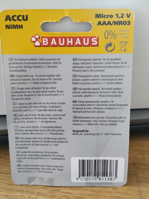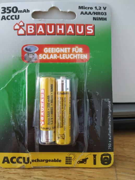 2 nerabljeni polnilni bateriji Bauhaus AAA/HR03, 350 mAh, Micro 1,2 V, NiMH.