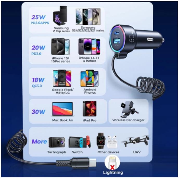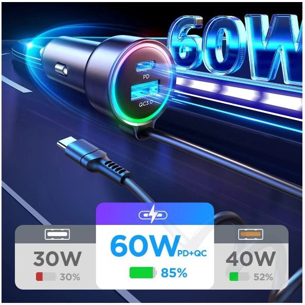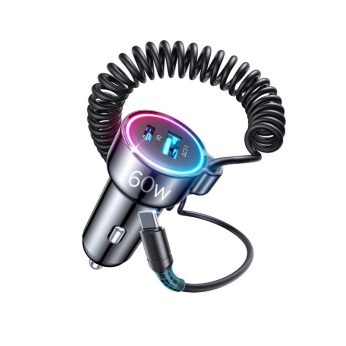 Polnilnik za avtomobil Joyroom za priključek za vžigalnik cigaret je osnovni pripomoček, ki je danes bistvena oprema za vsak avtomobil. Vozniki, še posebej profesionalni vozniki, ki veliko časa preživijo v avtu, morajo biti sposobni polniti svoje telefonske baterije, ne glede na to, kje so. Zato je tako pomembno imeti kakovostni polnilnik v vašem avtomobilu. Ta polnilnik je odlična izbira, saj njegova moč doseže do 60W! To omogoča zelo učinkovito polnjenje telefonov in drugih elektronskih naprav. Ima 1 USB vrata, 1 USB tipa C in vgrajen 1,6 m kabel USB tipa C. Uporabite ga lahko za polnjenje 3 naprav naenkrat.