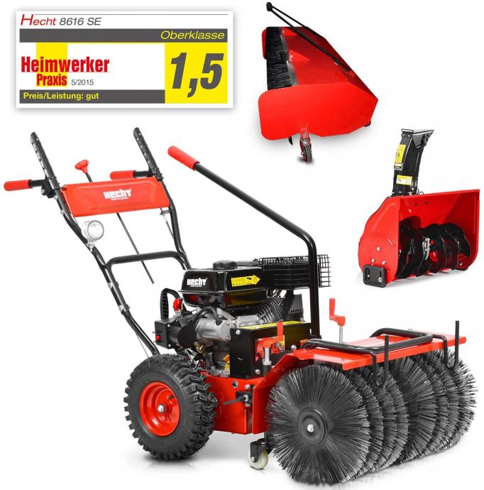 Pometalni stroj HECHT 8616 SE je namenjen za pometanje pločnikov, cest, dvorišč, parkirišč... Delovna širina vrtljive krtače je 62 cm( enak model z širino pometanja 80 cm stane 855 eur, zabojnik za njega pa stane 180 eur ), krtačo je možno zasukati v levo ali desno stran, z njo lahko pometate tudi sneg... Stroj ima 4 prestave naprej in 2 nazaj, delovno luč, poganja ga pa zmogljiv 4-taktni OHV motor znamke LONCIN s prostornino 196cc in močjo 6,5 KM, ima 13" kolesa in tehta 70 kg. zagon motorja je možen ročno z potezno vrvico ali pa z pritiskom na gumb, če stroj z el podaljškom povežete na električno omrežje. Možno je dokupiti snežne verige(40€), snežno frezo(225€), snežni plug(100€) in zaboj za pometene odpadke(160€). Garancija traja 1 leto od dneva nakupa. dostava na vaš naslov v Sloveniji stane 50,00€, možen je tudi osebni prevzem na naši lokaciji. zalogo in rok dobave preverite na tel št 051 231 460