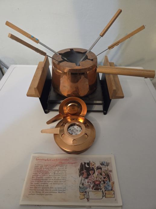 Vintage set za fondi iz bakra z lesenim stojalom in viličicami. Komplet je idealen za pripravo tradicionalnih fondijev in prinaša pridih nostalgije ter elegance v kuhinjo. set je funkcionalen in primeren za uporabo.