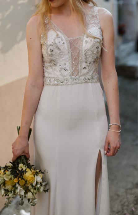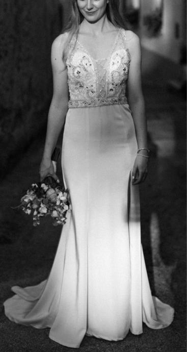 - [ ] Povsem oprijeta, a iz mehke tkanine v barvi šampanjca, tako da je zelo udobna in super primerna za ples in poročni žur. Zgornji del do pasu je posut z lepimi okrasnimi kamenčki, ima naramnice, hrbtni del pa je res nekaj posebnega (glej slike). Krilo ima razporek (ne previsok, a je kar opazen), mehko pada na tla in ima malo vlečke, je brez kamenčkov. Krilo je prilagojeno tako, da ima zadaj majhen gumbek, zato se lahko dvigne, da se med plesom ne vleče po tleh. Preverjeno zdrži celotno svatbo.