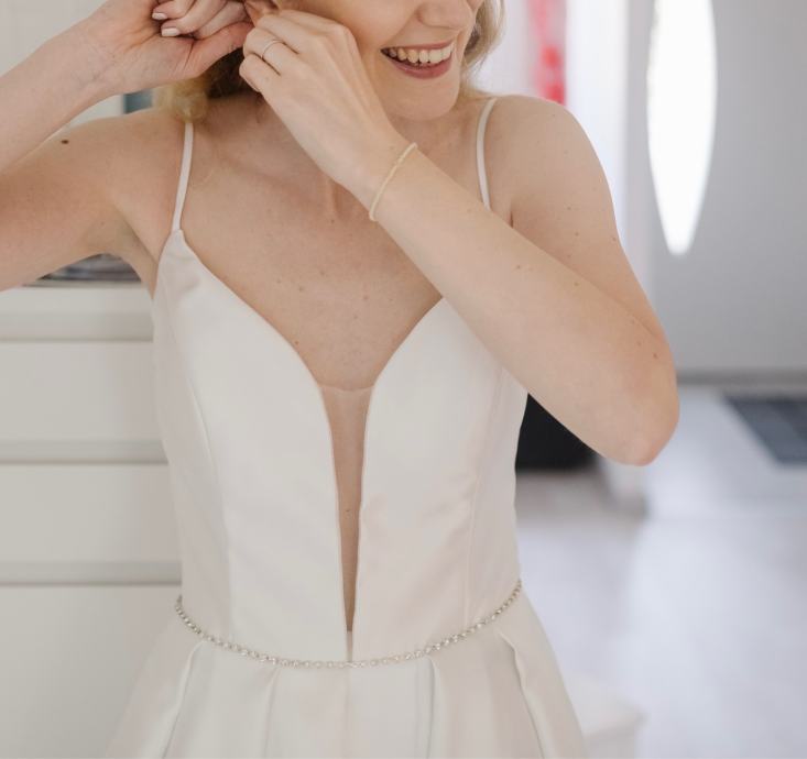 - [ ] je iz elegantnega belega satena, v životcu povsem oprijeta, z ozkimi naramnicami, dekolte je globoko rezan (a še vedno povsem eleganten in ne preveč ''provokativen'') z vmesno prosojno mrežico kožne barve, v pasu ima tanek pas iz bleščečih kamenčkov v videzu diamantkov (pas je snemljiv), krilo elegantno in lahkotno pade v obliki črke A, ni preširoko in ne preozko, ima skrite žepe (pridejo prav ), krilo ima razporek, ki pa skoraj ni viden in ni moteč, pride pa zelo lepo, ker se vsake toliko časa vidijo poročni čevlji.
