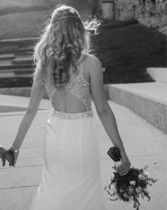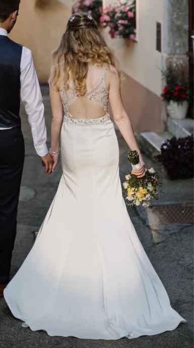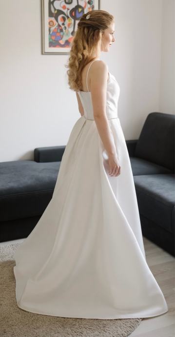 Ta obleka je bila moja ''dnevna'' oziroma glavna poročna obleka. Ker je večna klasika, ne gre nikoli iz mode, primerna pa je za vsak tip poroke. Prilagojena je na moje mere: