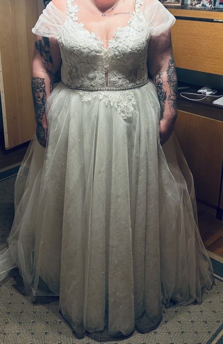 Prodam poročno obleko konf. Št. 46-52 večji razpon ker je obleka zadaj na prevez je zelo udobna. Zraven imam tudi krinolino za pod obleko.