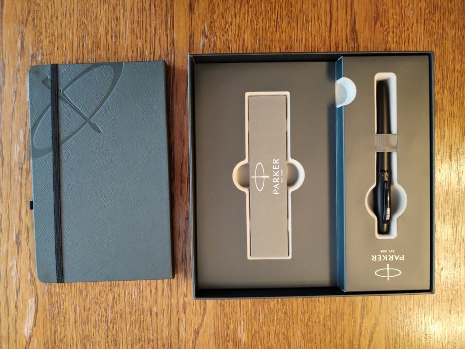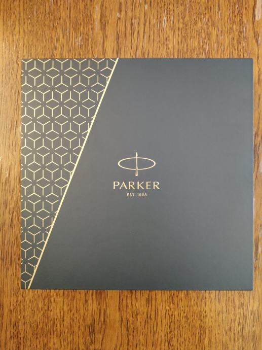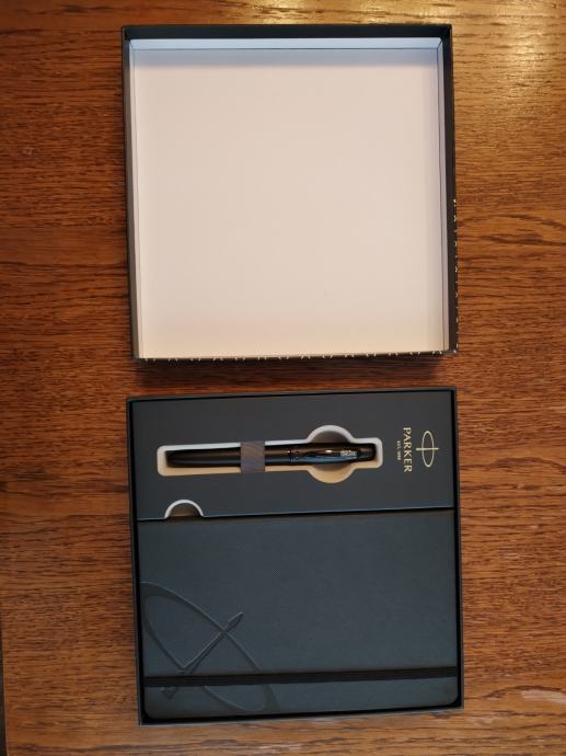 Prodam nov set znamke Parker, ki vsebuje lično embalažo z beležko in nalivnim peresom v črni oziroma temno sivi barvi.