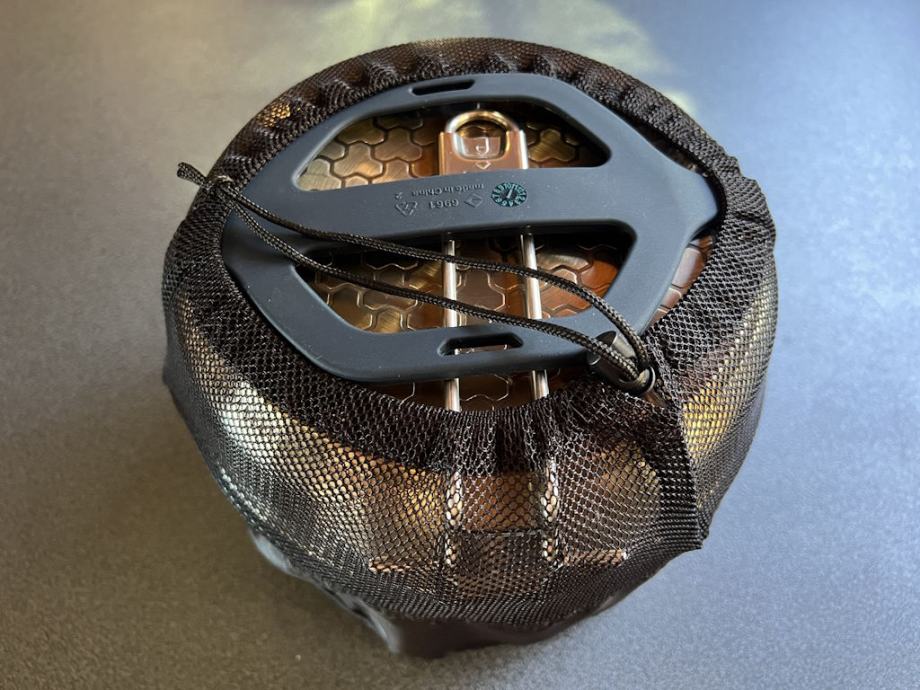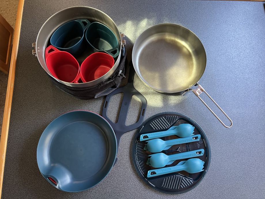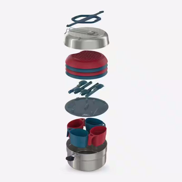 Prodam kuhinjski set za kampiranje za 4 osebe s 25 elementi: kozica 2,5 litra in ponev fi 20cm iz nerjavečega jekla, pokrov, 4x skodelica 2dl z ročajem, 4x krožnik fi 19cm, 4x žlica, 4x vilica, 4x nož ter podloga za polaganje vročih posod na mizo. Vse skupaj v priročni torbici s trakom za nošenje. Set je zelo kompakten (vse se zloži v ta glavno posodo), zasede zgolj prostor premera 21cm in višin 18cm, vse skupaj pa tehta le 1.850g. Kozica in ponev delujeta na vseh virih toplote: plin, drva, indukcija.