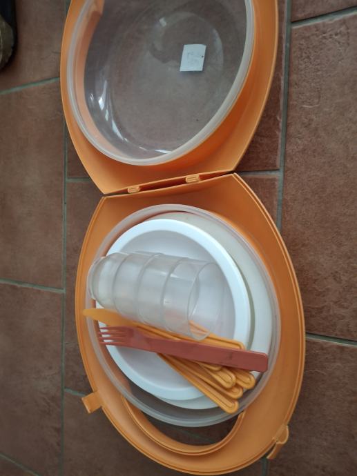 Priročen plastičen pribor za kampiranje, lepo se zloži in je praktičen za prenašanje. Pribor vsebuje 2 skledi, 6 krožnikov (4plitvi in 2 globlja), 3 kozarci in pribor kot je na slikah - manjka nekaj kosov, ki pa se lahko nadomestijo.