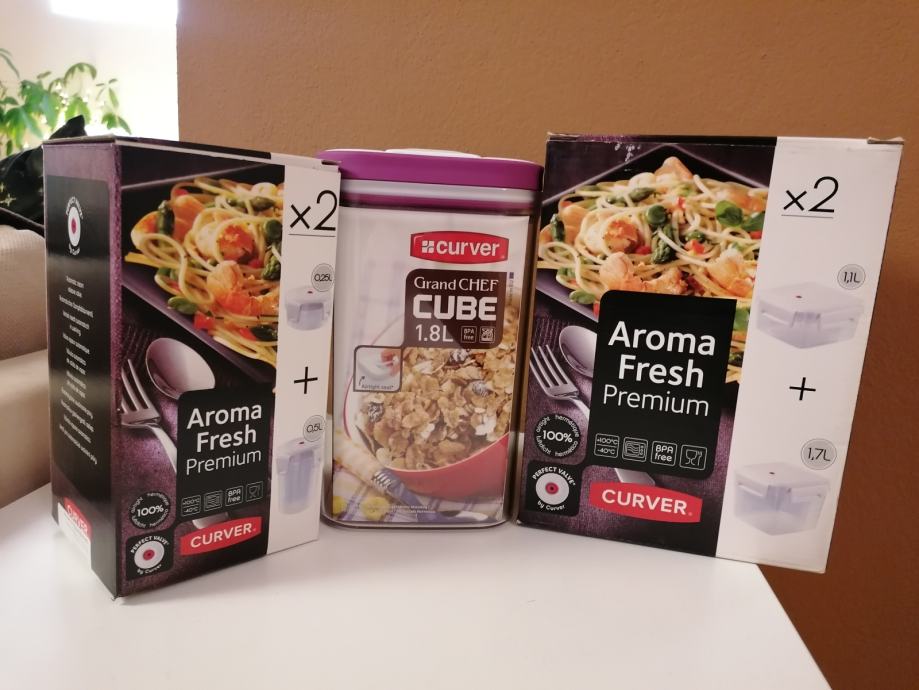 Ena posamezna posoda Grand chef cube 1,8l in še dvakrat komplet Aroma fresh premium posod. V prvem kompletu sta posodici 0,25 in 0,5l, v drugem kompletu pa sta posodici 1,1 in 1,7l.