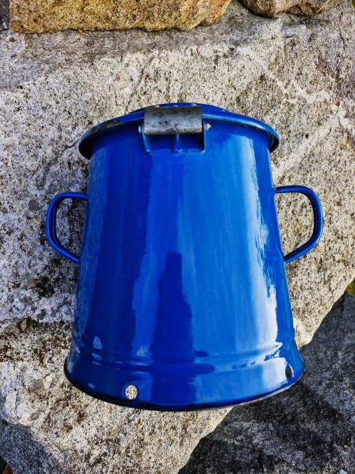 Naprodaj brezhibno ohranjena emajlirana posoda s pokrovom, deža, čeber, z dvema ročajema, za shranjevanje masti, zaseke, tunke, mesa, ocvirkov in podobno, premer spodaj 22 cm, višina 23 cm, izdelava EMO Celje.