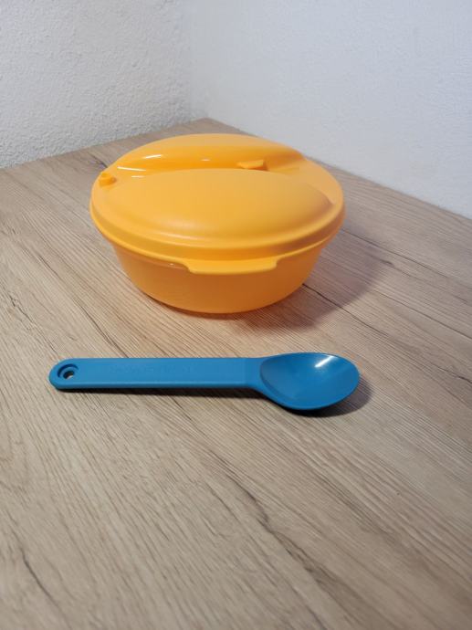 Tupperware posoda (600 ml) z ujemajočo modro žličko – vse, kar potrebuješ za uravnotežen obrok na poti.