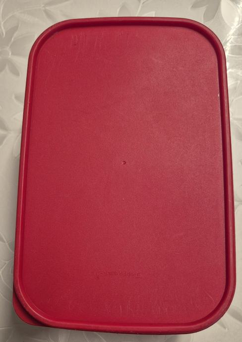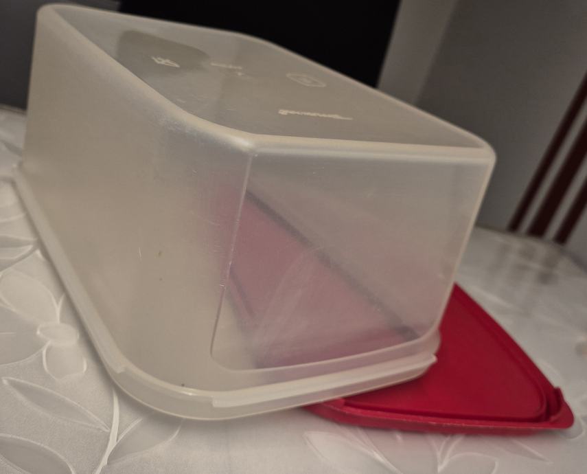 Prodajam rabljeno posodo za shranjevanje živil znamke Tupperware, ki je v dobrem stanju. Komplet vključuje prozorno plastično posodo in rdeč pokrov, ki zagotavlja popolno tesnjenje. Idealna je za shranjevanje in organizacijo živil v vaši kuhinji. Volumen je 4.5l.