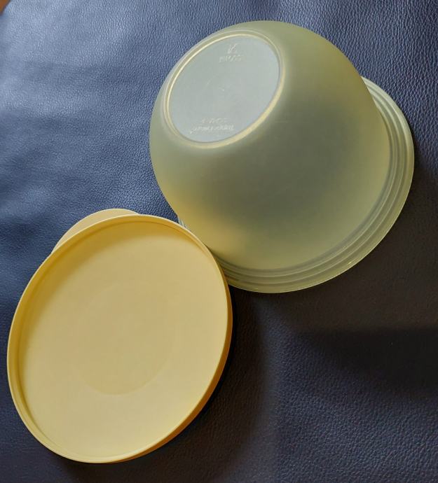 Okrogla posoda za shranjevanje živil znamke Tupperware. Rabljena, volumen 550ml.