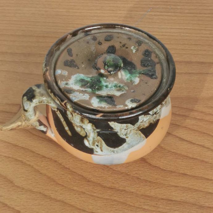 Ročno izdelana keramična posodica za med z glazuro v naravnih zemeljskih tonih in pokrovčkom. Primerna za postrežbo medu ali drugih dobrot.