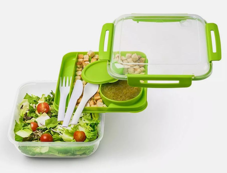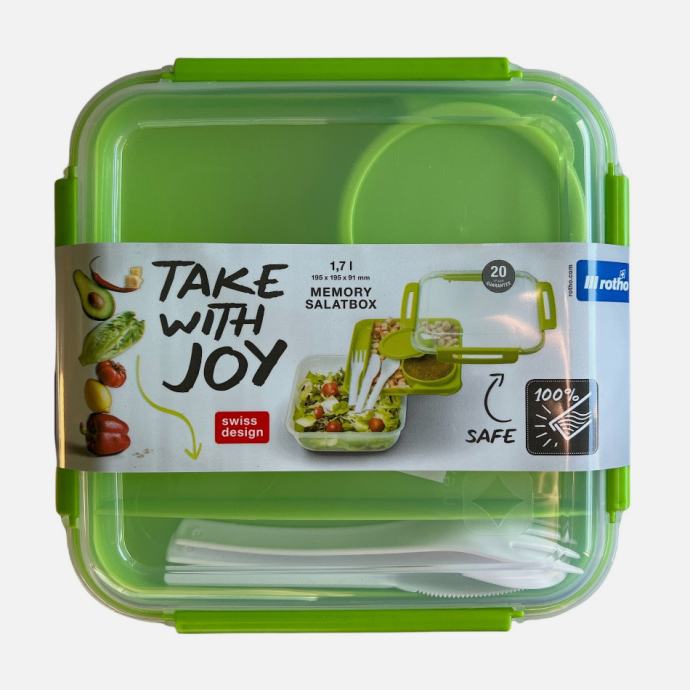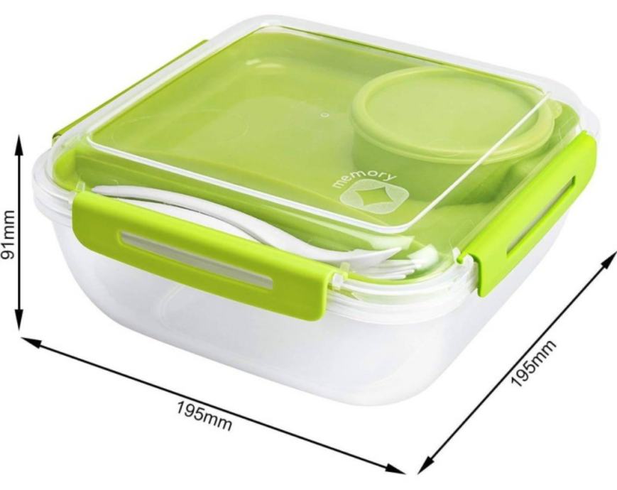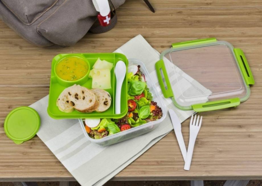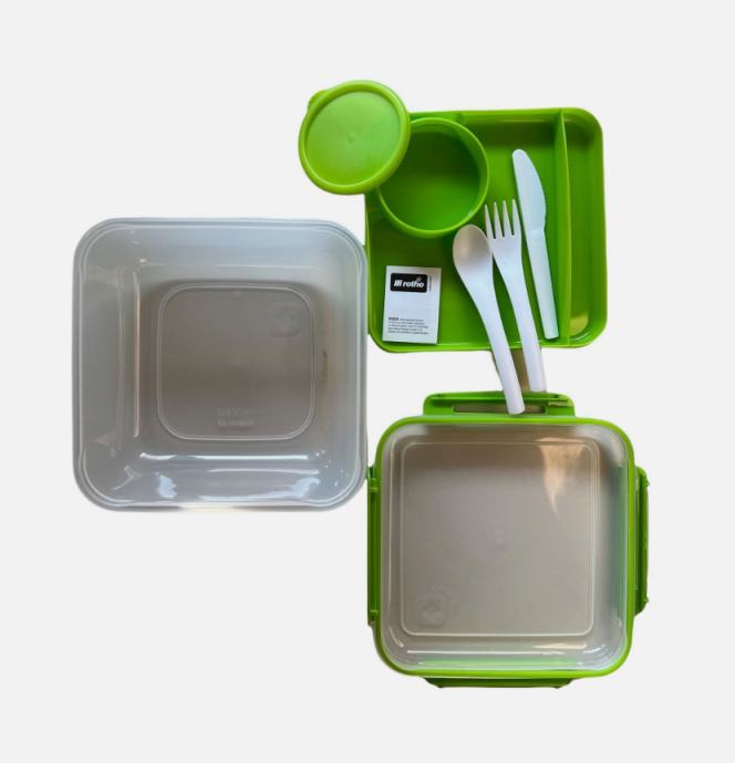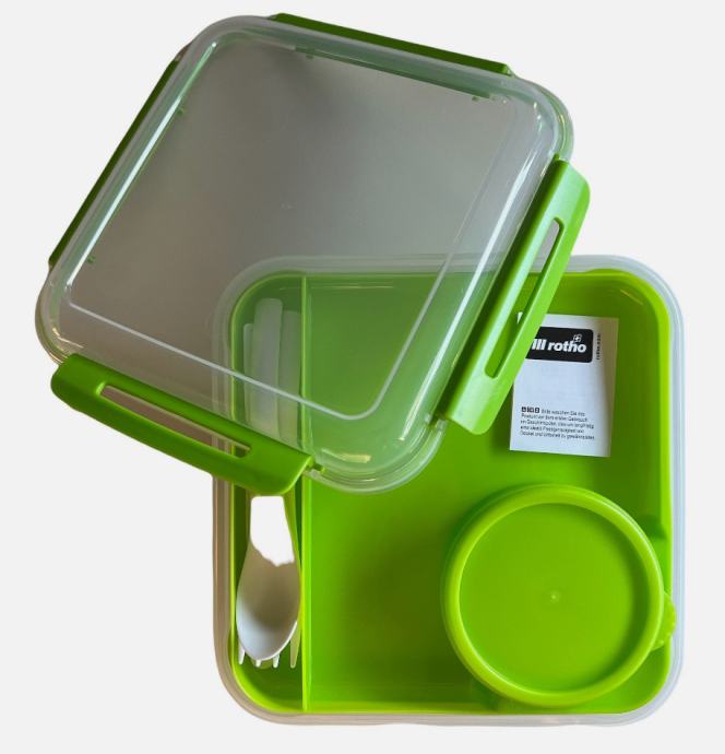Vodotesna škatla s pokrovom vsebuje: Notranji ločevalni pladenj, majhno posodo za solatni preliv ali drugo tekočino in 3-delni jedilni pribor.