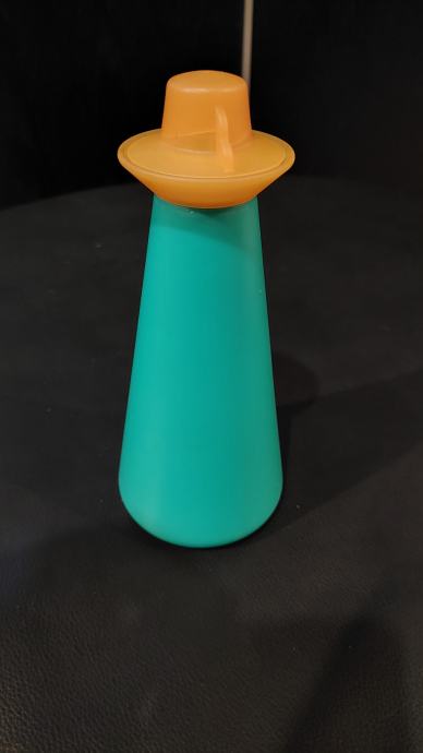 Tupperware vrček za kis ali olje turkizne barve z oranžnim pokrovom. Praktična posoda za shranjevanje in doziranje tekočin v kuhinji. Idealen dodatek za vsako kuhinjo.